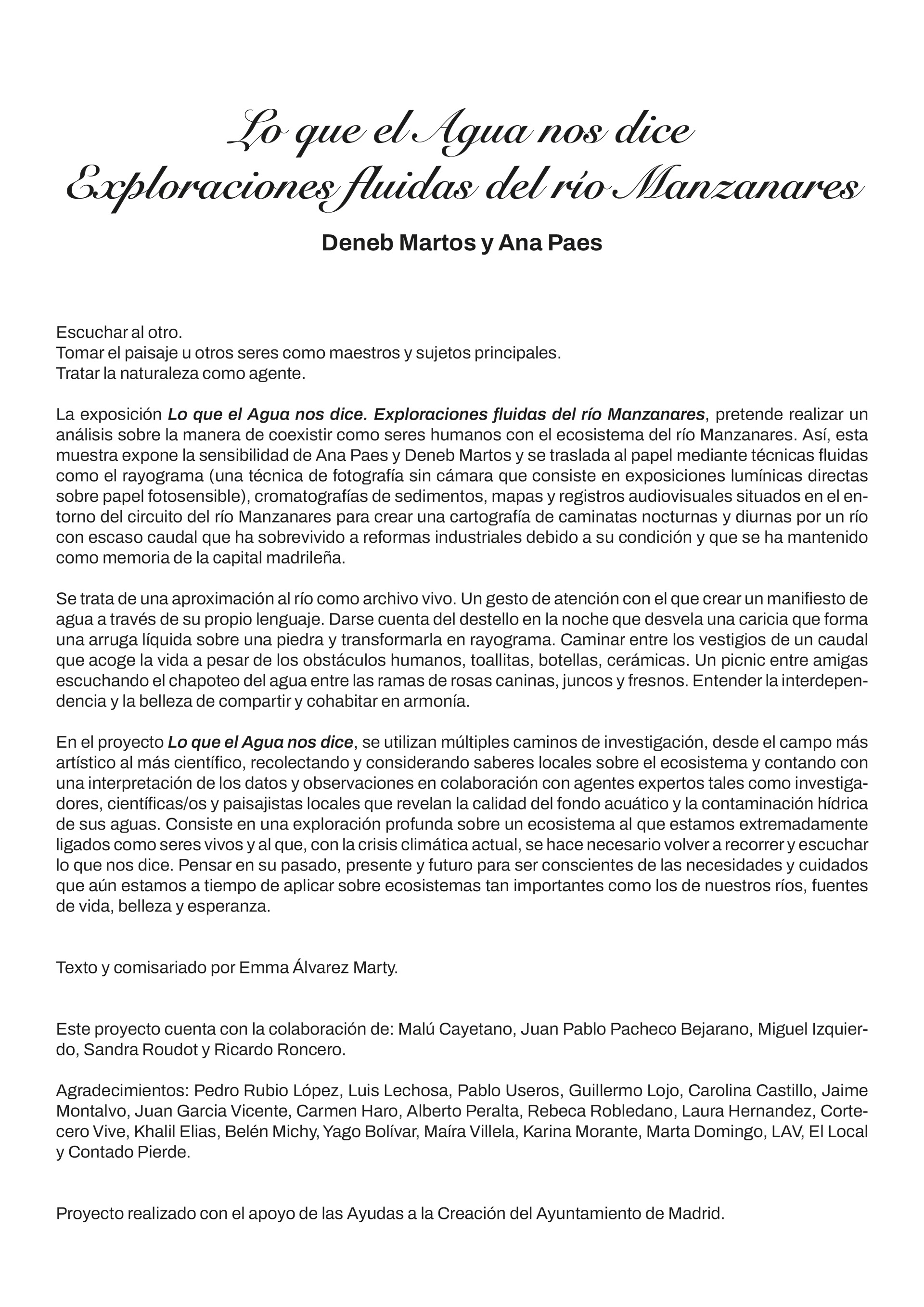 2025 Texto curatorial para la exposición 'Lo que el Agua nos dice. Exploraciones fluidas del rio Manzanares', de las artistas Deneb Martos y Ana Paes. El Local.